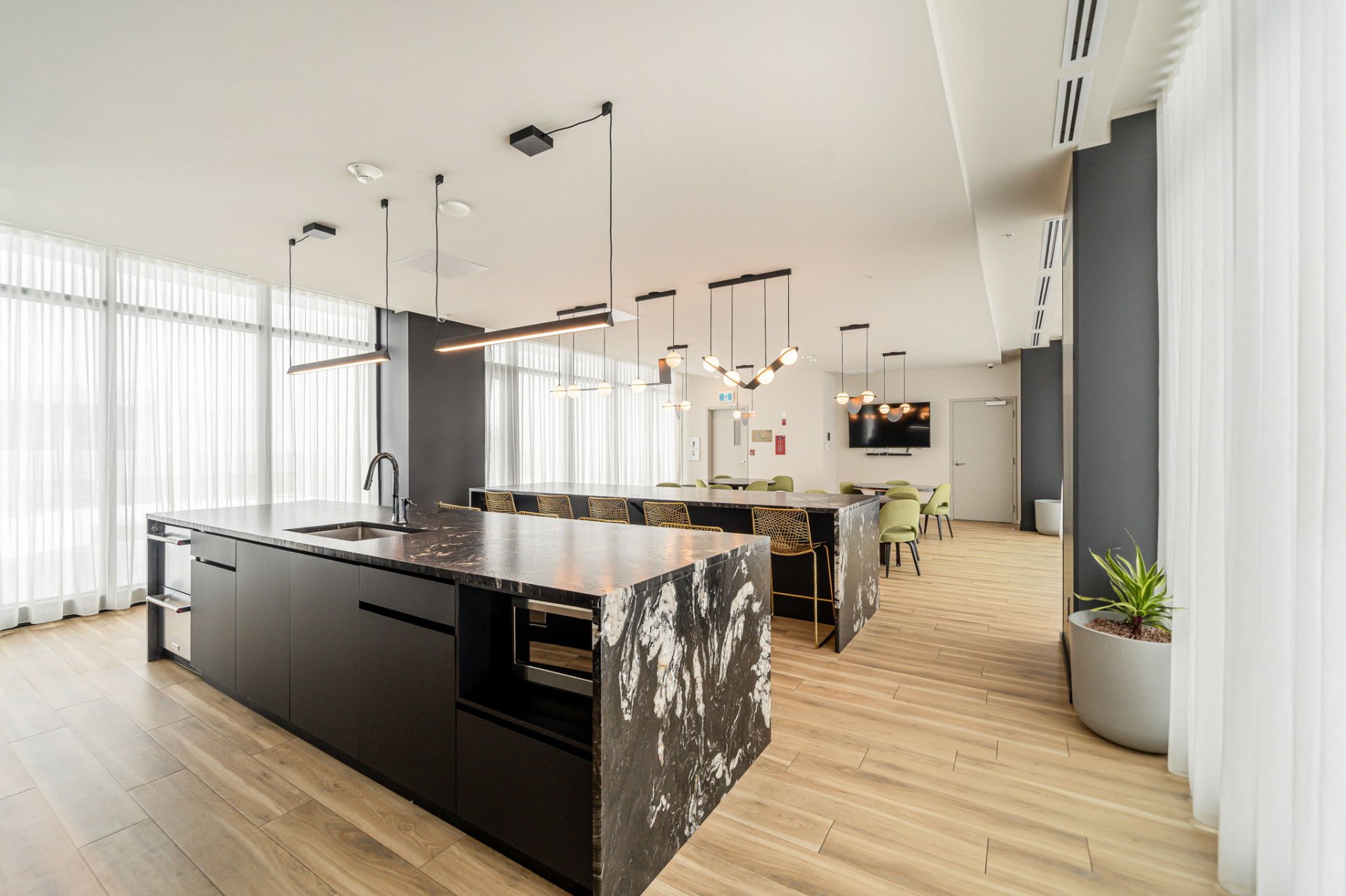 Réfrigérateur, cuisinière, lave-vaisselle, laveuse, sécheuse, luminaires, rideaux.